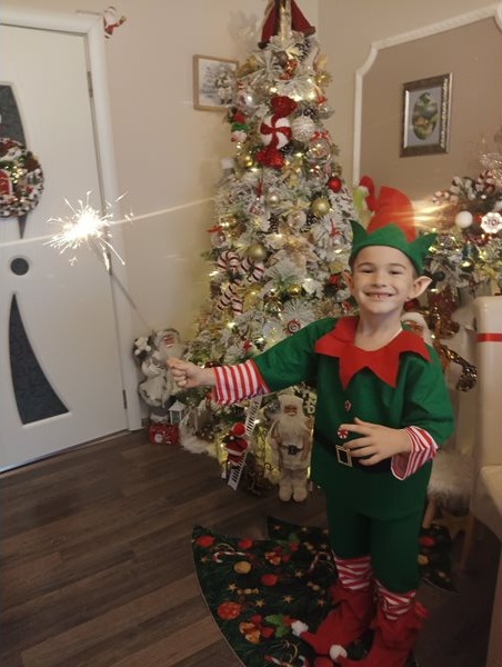 7-годишният Тошко позира с коледното си костюмче до красивата елха.