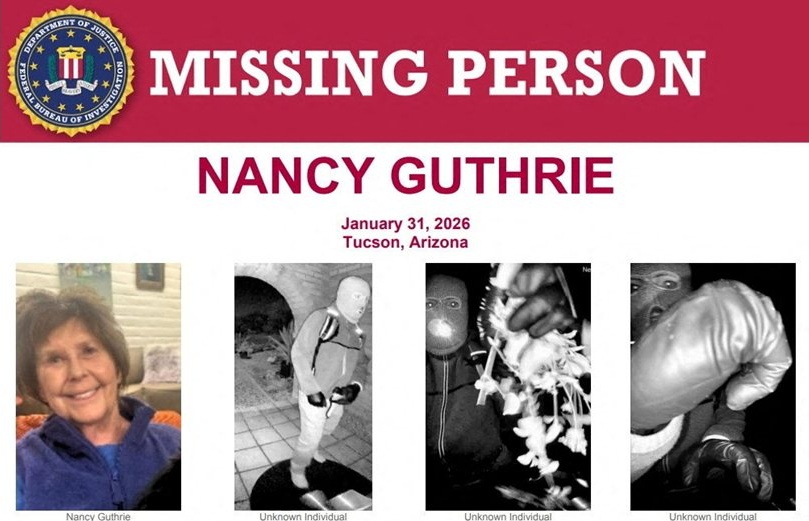 На плакат са изобразени Нанси Гътри и въоръжен мъж, който изглежда е повредил камерата на входната й врата в ранните часове деня, в когато тя изчезна от дома си в Тусон. СНИМКА: РОЙТЕРС