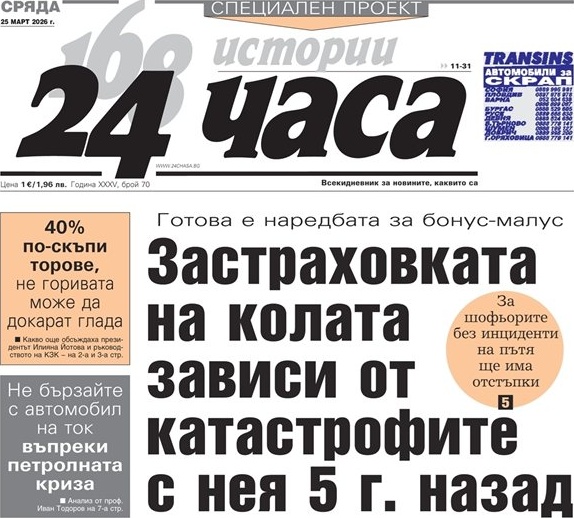 Новият брой на вестник „24 часа“ от 25 март анализира сериозните икономически заплахи пред България. Основната тема разкрива поскъпването на торовете с над 40%. Този скок може да предизвика глад по-бързо от кризата с горивата. Експертите предупреждават за критична ситуация в земеделието и продоволствието.