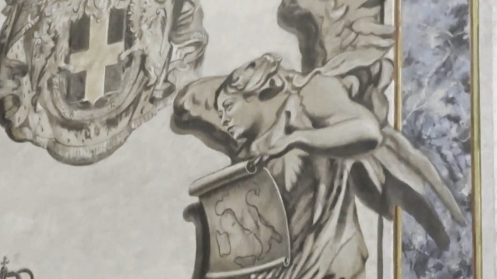 Изображението показва небесно същество, което държи свитък с карта на Италия. Въпреки поразителното сходство с лицето на Мелони, авторът на творбата Бруно Валентинети отрича всякаква умисъл. Той поясни, че е възстановил оригиналната фреска отпреди 25 години, без да добавя нови елементи. Самата Джорджа Мелони реагира с чувство за хумор на ситуацията в социалните мрежи.