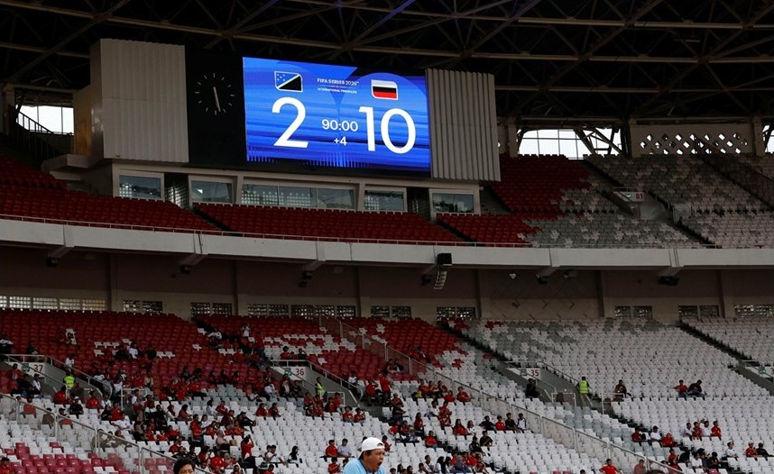 Историческото табло за българския футбол на почти празния стадион в Джакарта Снимка: Startphoto.bg
