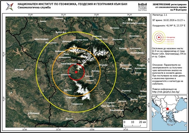 Слабо земетресение с магнитуд 2.1 по Рихтер разлюля района на Благоевград и Разлог на 16 февруари 2026 г. Епицентърът е на 12 км от Разлог.